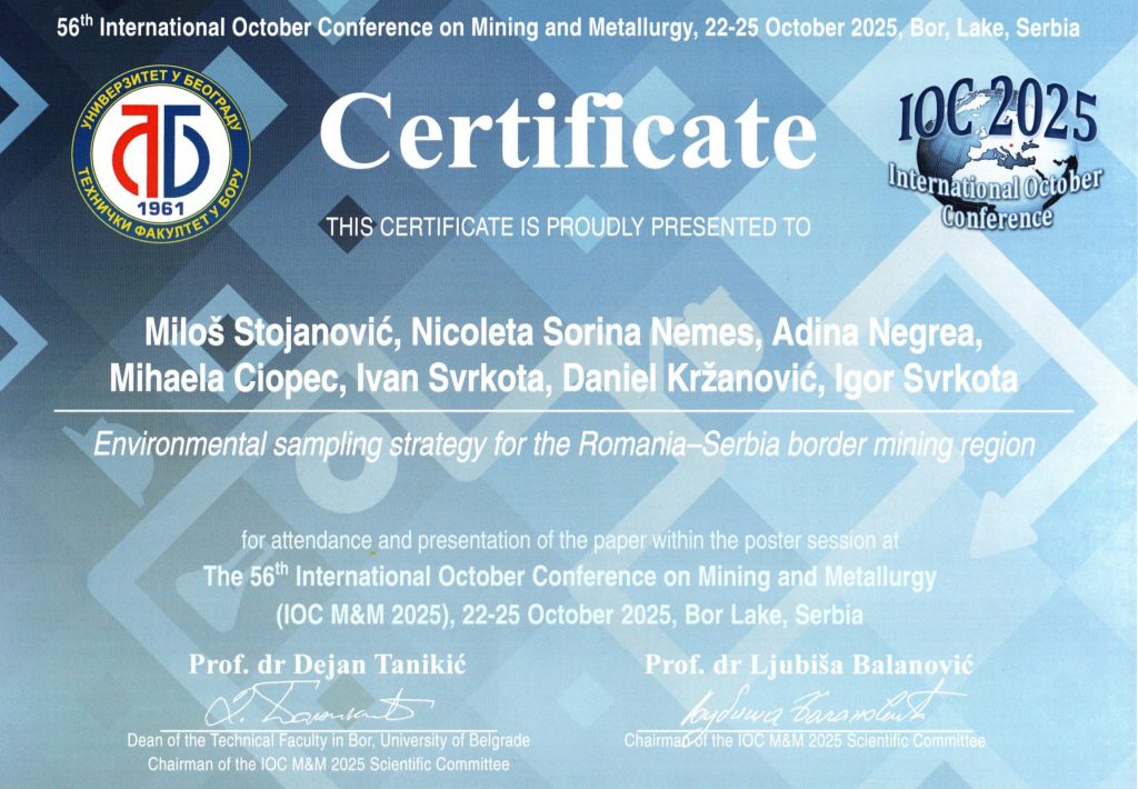 The project was presented through the paper “Environmental Sampling Strategy for the Romania–Serbia Mining Region,” showcased during the poster session. The paper outlines the sampling strategy and the approach to environmental risk assessment in the cross-border mining region of Serbia and Romania, as well as preliminary project results achieved so far through joint cooperation.